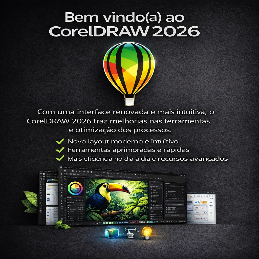 Transforme suas ideias em projetos profissionais com a versão mais recente e otimizada do CorelDRAW. Desenvolvido para designers, comunicadores visuais e empreendedores que não podem perder tempo, o CorelDRAW 2026 entrega as ferramentas e vetorização que você precisa para se destacar no mercado.